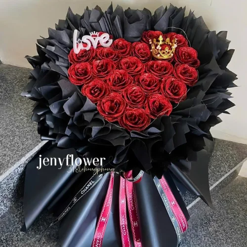 • Độc đáo và không lỗi thời: Thiết kế trái tim kết hợp nhũ lấp lánh mang lại sự mới lạ, khác biệt so với các bó hoa truyền thống.